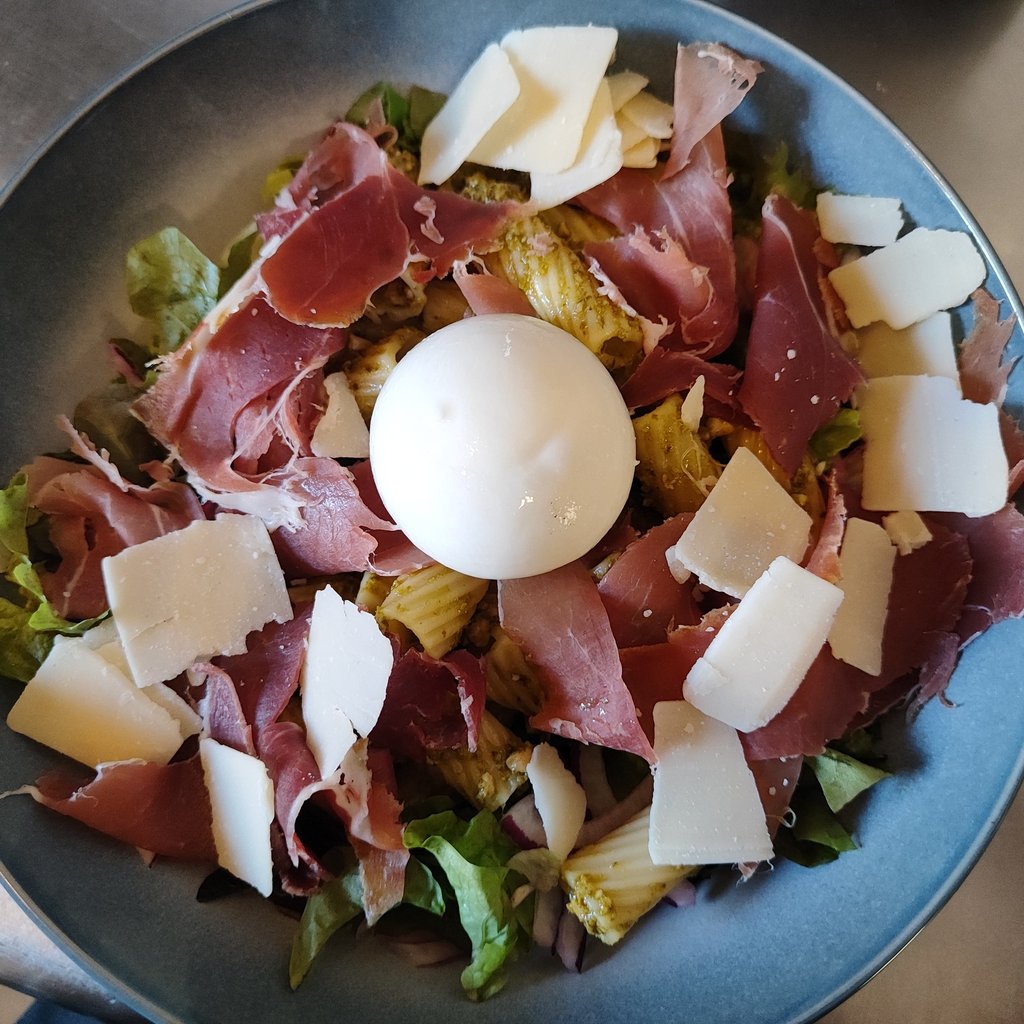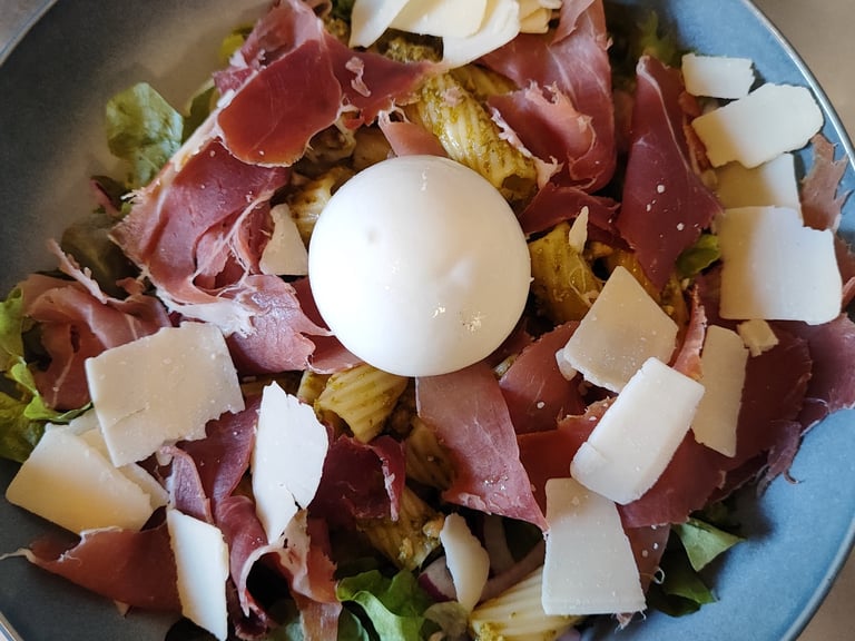 Pâtes, Salade, Tomates, Oignons Rouge, Parme, Burratina, Pesto, Parmesan